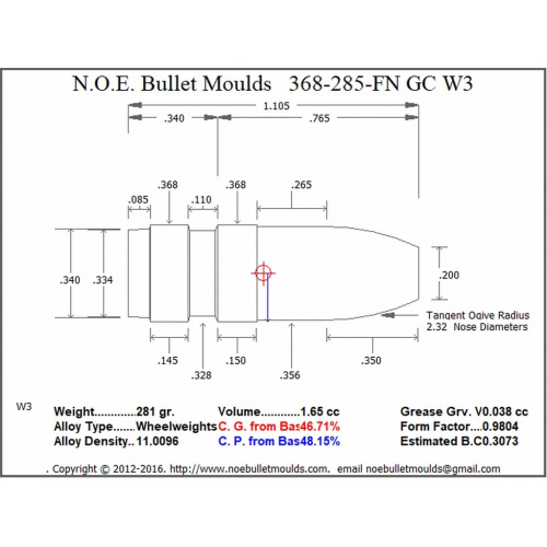 In-Stock g/ch 9.3 275 gr. FN (sized .368) OAL 1.105, Meplat 0.200, Nose to crimp groove 0.695